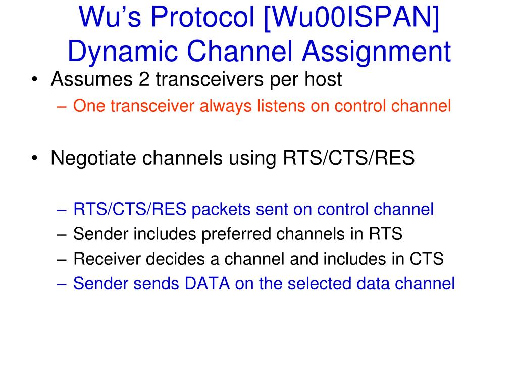 Wu’s Protocol [Wu00ISPAN]Dynamic Channel Assignment • Assumes 2 transceivers per host • One transceiver always listens on control channel • Negotiate channels using RTS/CTS/RES • RTS/CTS/RES packets sent on control channel • Sender includes preferred channels in RTS • Receiver decides a channel and includes in CTS • Sender sends DATA on the selected data channel