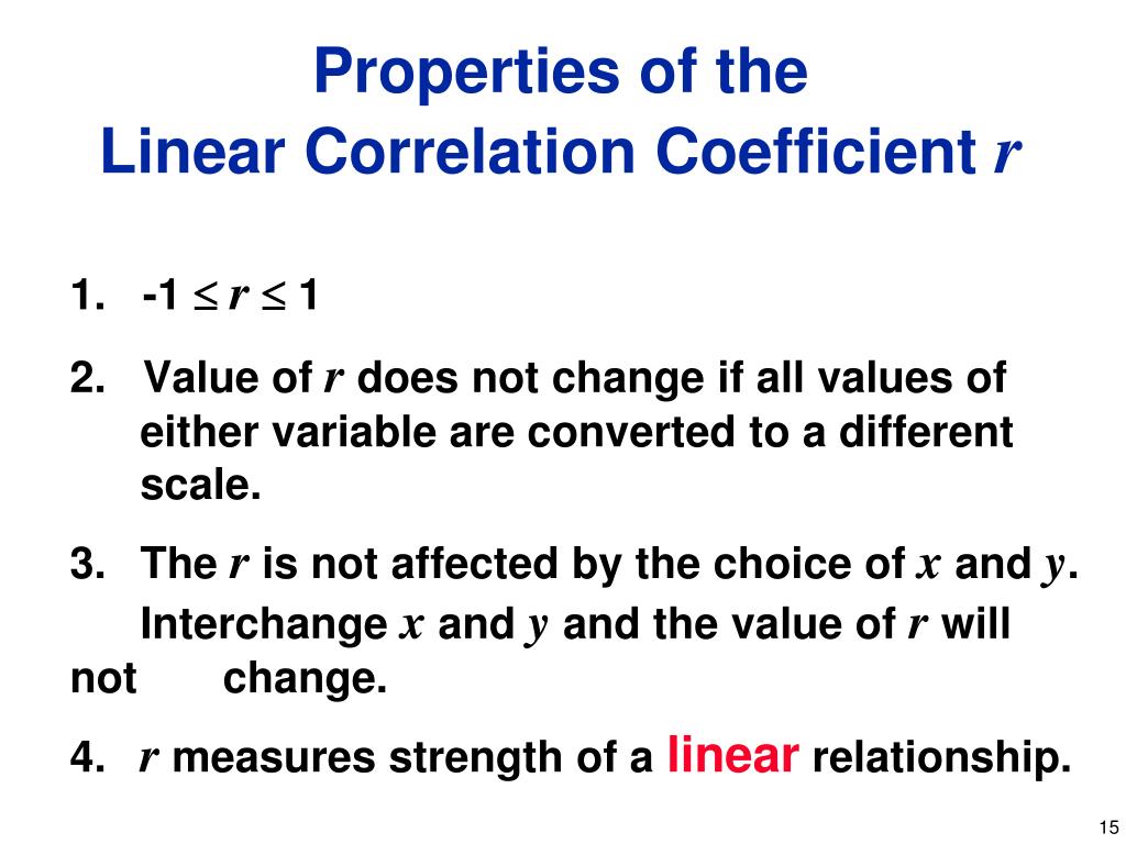 1. -1 r 1 2. Value of r does not change if all values of either variable are converted to a different scale. 3. The r is not affected by the choice of x and y. Interchange x and y and the value of r will not change. 4. r measures strength of a linear relationship. Properties of the Linear Correlation Coefficient r