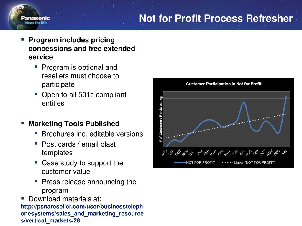 Not for Profit Process Refresher • Program includes pricing concessions and free extended service • Program is optional and resellers must choose to participate • Open to all 501c compliant entities • Marketing Tools Published • Brochures inc. editable versions • Post cards / email blast templates • Case study to support the customer value • Press release announcing the program • Download materials at: • http://psnareseller.com/user/businesstelephonesystems/sales_and_marketing_resources/vertical_markets/28