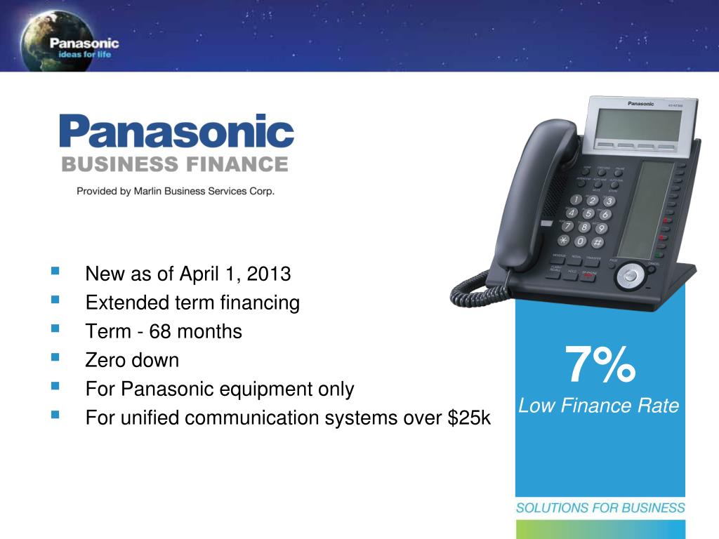 New as of April 1, 2013 • Extended term financing • Term - 68 months • Zero down • For Panasonic equipment only • For unified communication systems over $25k 7% Low Finance Rate