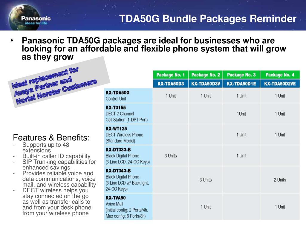 TDA50G Bundle Packages Reminder • Panasonic TDA50G packages are ideal for businesses who are looking for an affordable and flexible phone system that will grow as they grow Ideal replacement for Avaya Partner and Nortel Norstar Customers • Features & Benefits: • Supports up to 48 extensions • Built-in caller ID capability • SIP Trunking capabilities for enhanced savings • Provides reliable voice and data communications, voice mail, and wireless capability • DECT wireless helps you stay connected on the go as well as transfer calls to and from your desk phone from your wireless phone