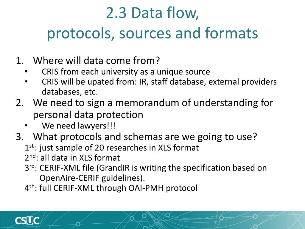 2.3 Data flow, protocols, sources and formats • Where will data come from? • CRIS from each university as a unique source • CRIS will be upated from: IR, staff database, external providers databases, etc. • We need to sign a memorandum of understanding for personal data protection • We need lawyers!!! • What protocols and schemas are we going to use? 1st: just sample of 20 researches in XLS format 2nd: all data in XLS format 3rd: CERIF-XML file (GrandIR is writing the specification based on OpenAire-CERIF guidelines). 4th: full CERIF-XML through OAI-PMH protocol