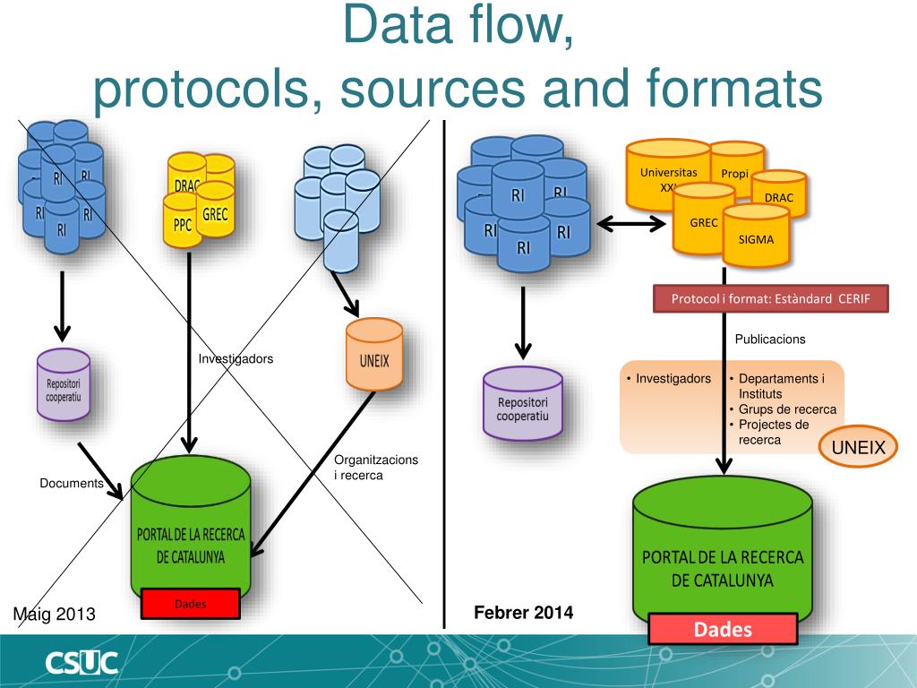 Data flow, protocols, sources and formats Universitas XXI Propi DRAC GREC SIGMA Protocol i format: Estàndard CERIF Publicacions Investigadors • Investigadors • Departaments i Instituts • Grups de recerca • Projectes de recerca UNEIX Organitzacions i recerca Documents Febrer 2014 Maig 2013 Dades Dades