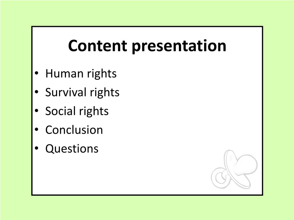 Content presentation • Humanrights • Survival rights • Socialrights • Conclusion • Questions
