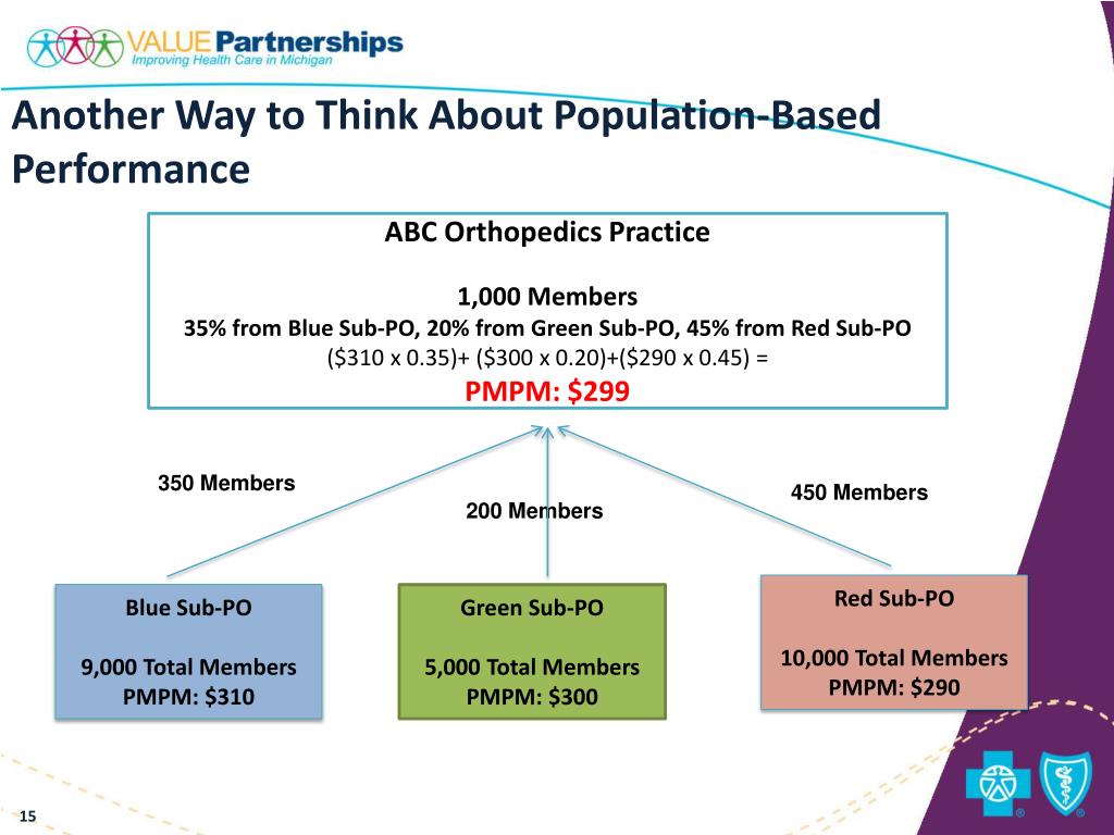 Another Way to Think About Population-Based Performance ABC Orthopedics Practice 1,000 Members 35% from Blue Sub-PO, 20% from Green Sub-PO, 45% from Red Sub-PO ($310 x 0.35)+ ($300 x 0.20)+($290 x 0.45) = PMPM: $299 350 Members 450 Members 200 Members Red Sub-PO 10,000 Total Members PMPM: $290 Blue Sub-PO 9,000 Total Members PMPM: $310 Green Sub-PO 5,000 Total Members PMPM: $300