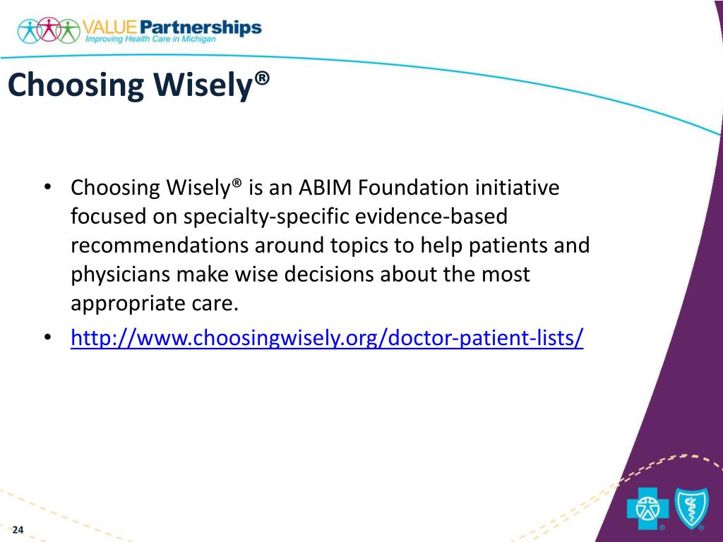 Choosing Wisely® • Choosing Wisely® is an ABIM Foundation initiative focused on specialty-specific evidence-based recommendations around topics to help patients and physicians make wise decisions about the most appropriate care. • http://www.choosingwisely.org/doctor-patient-lists/