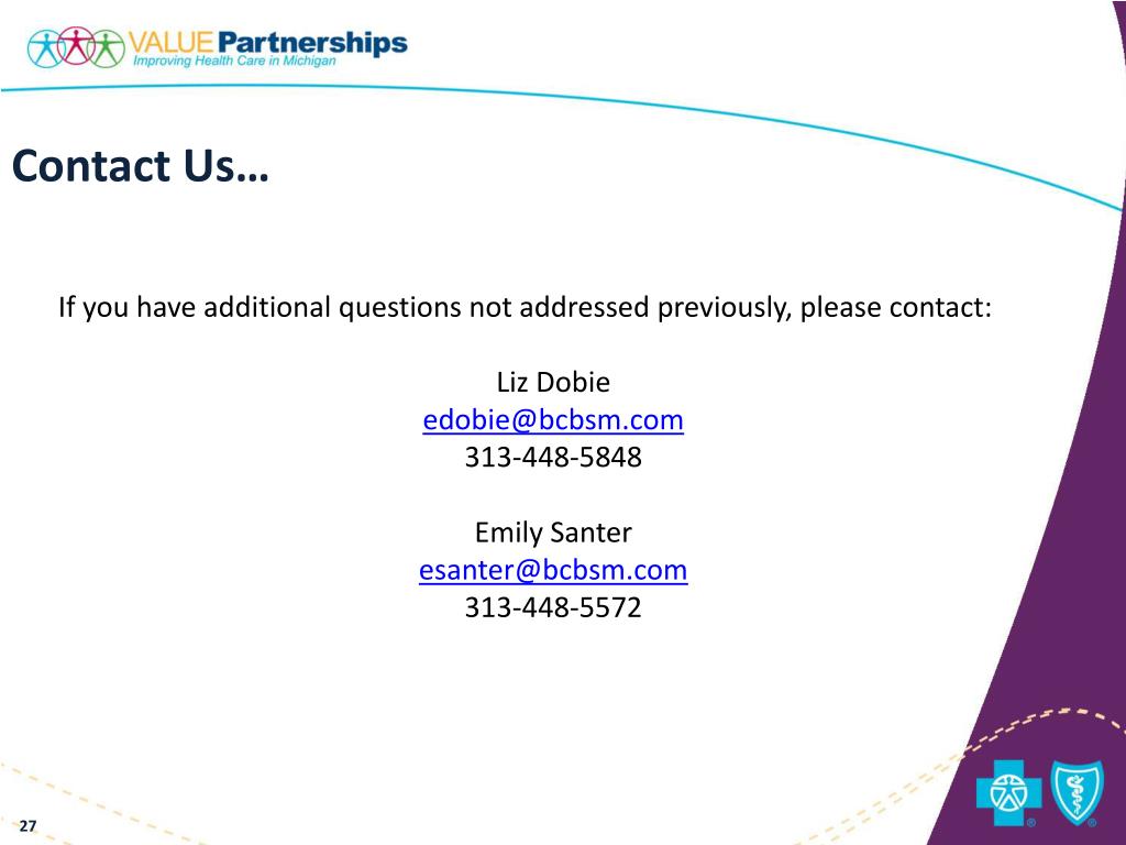 Contact Us… If you have additional questions not addressed previously, please contact: Liz Dobie edobie@bcbsm.com 313-448-5848 Emily Santer esanter@bcbsm.com 313-448-5572