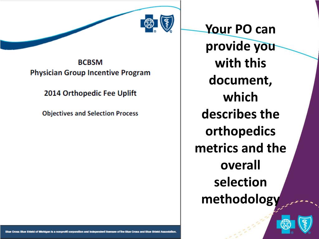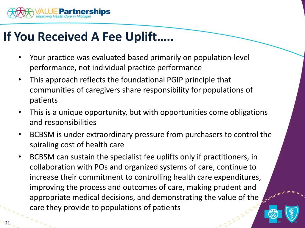 If You Received A Fee Uplift….. • Your practice was evaluated based primarily on population-level performance, not individual practice performance • This approach reflects the foundational PGIP principle that communities of caregivers share responsibility for populations of patients • This is a unique opportunity, but with opportunities come obligations and responsibilities • BCBSM is under extraordinary pressure from purchasers to control the spiraling cost of health care • BCBSM can sustain the specialist fee uplifts only if practitioners, in collaboration with POs and organized systems of care, continue to increase their commitment to controlling health care expenditures, improving the process and outcomes of care, making prudent and appropriate medical decisions, and demonstrating the value of the care they provide to populations of patients