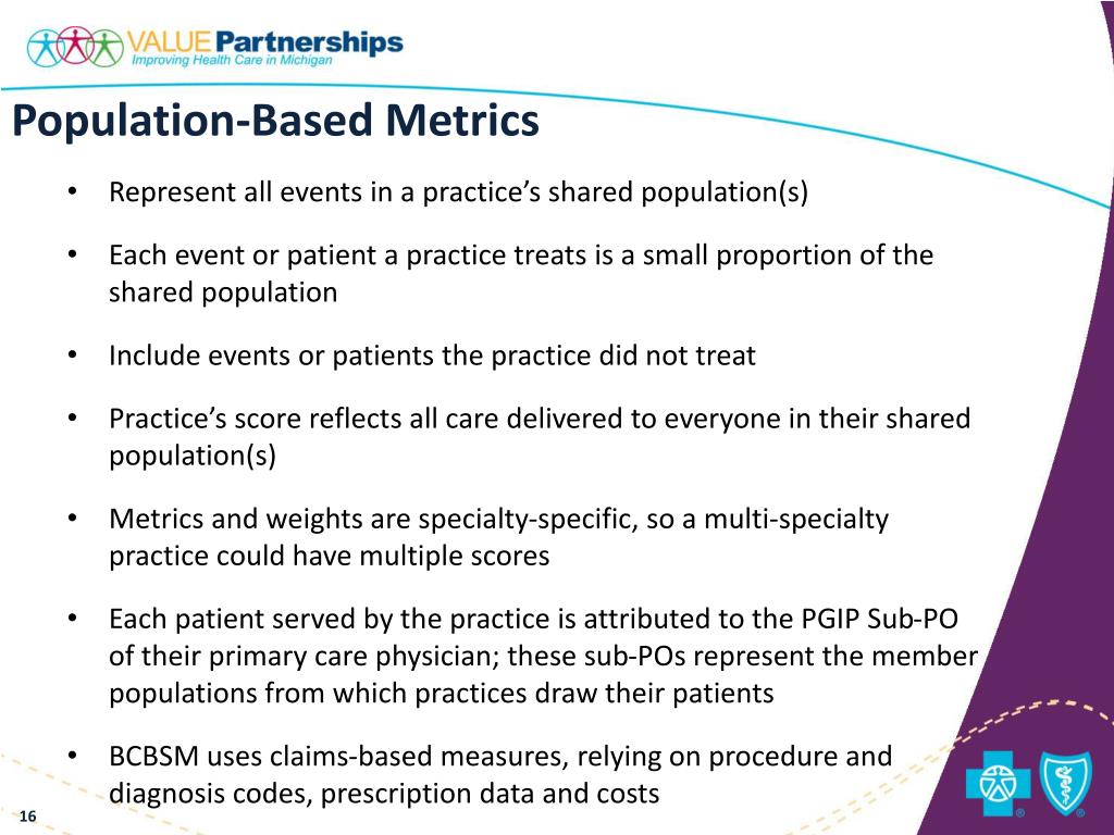 Population-Based Metrics • Represent all events in a practice’s shared population(s) • Each event or patient a practice treats is a small proportion of the shared population • Include events or patients the practice did not treat • Practice’s score reflects all care delivered to everyone in their shared population(s) • Metrics and weights are specialty-specific, so a multi-specialty practice could have multiple scores • Each patient served by the practice is attributed to the PGIP Sub-PO of their primary care physician; these sub-POs represent the member populations from which practices draw their patients • BCBSM uses claims-based measures, relying on procedure and diagnosis codes, prescription data and costs