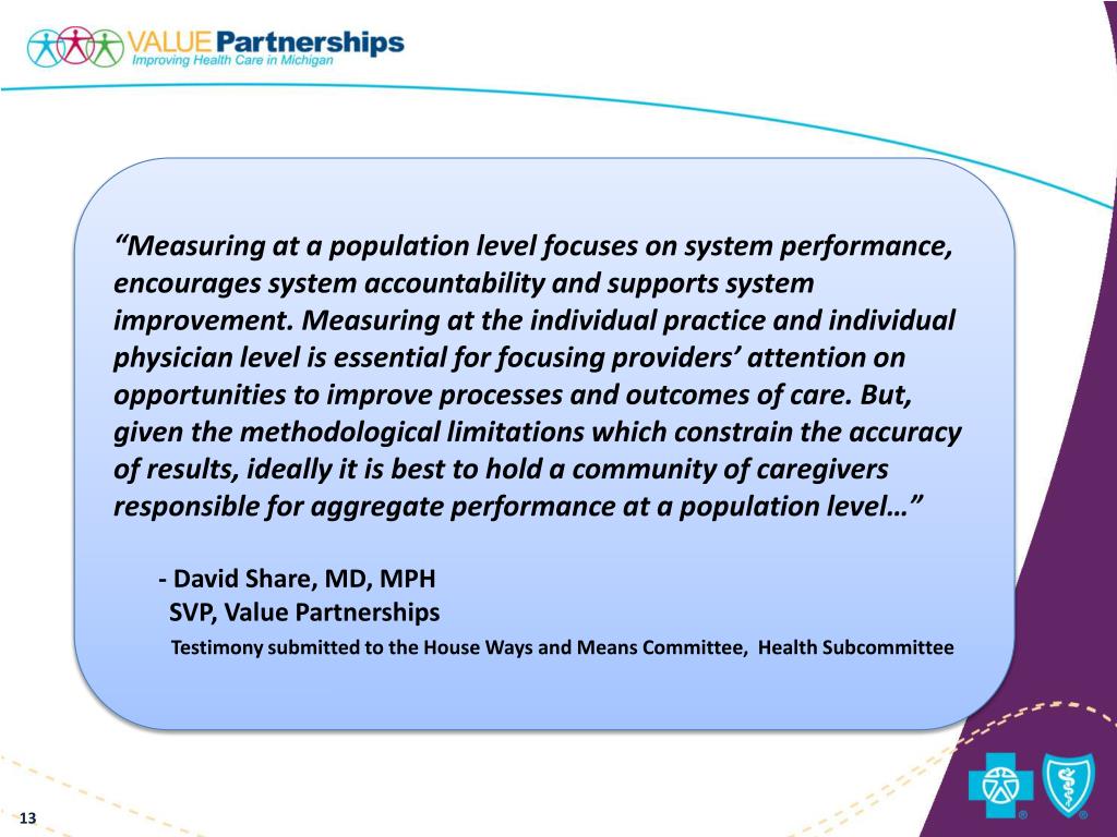 “Measuring at a population level focuses on system performance, encourages system accountability and supports system improvement. Measuring at the individual practice and individual physician level is essential for focusing providers’ attention on opportunities to improve processes and outcomes of care. But, given the methodological limitations which constrain the accuracy of results, ideally it is best to hold a community of caregivers responsible for aggregate performance at a population level…” - David Share, MD, MPH SVP, Value Partnerships Testimony submitted to the House Ways and Means Committee, Health Subcommittee