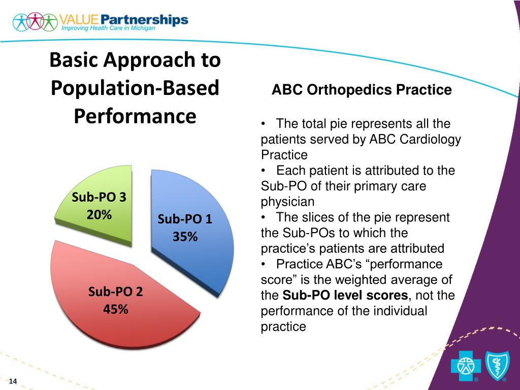 ABC Orthopedics Practice • The total pie represents all the patients served by ABC Cardiology Practice • Each patient is attributed to the Sub-PO of their primary care physician • The slices of the pie represent the Sub-POs to which the practice’s patients are attributed • Practice ABC’s “performance score” is the weighted average of the Sub-PO level scores, not the performance of the individual practice