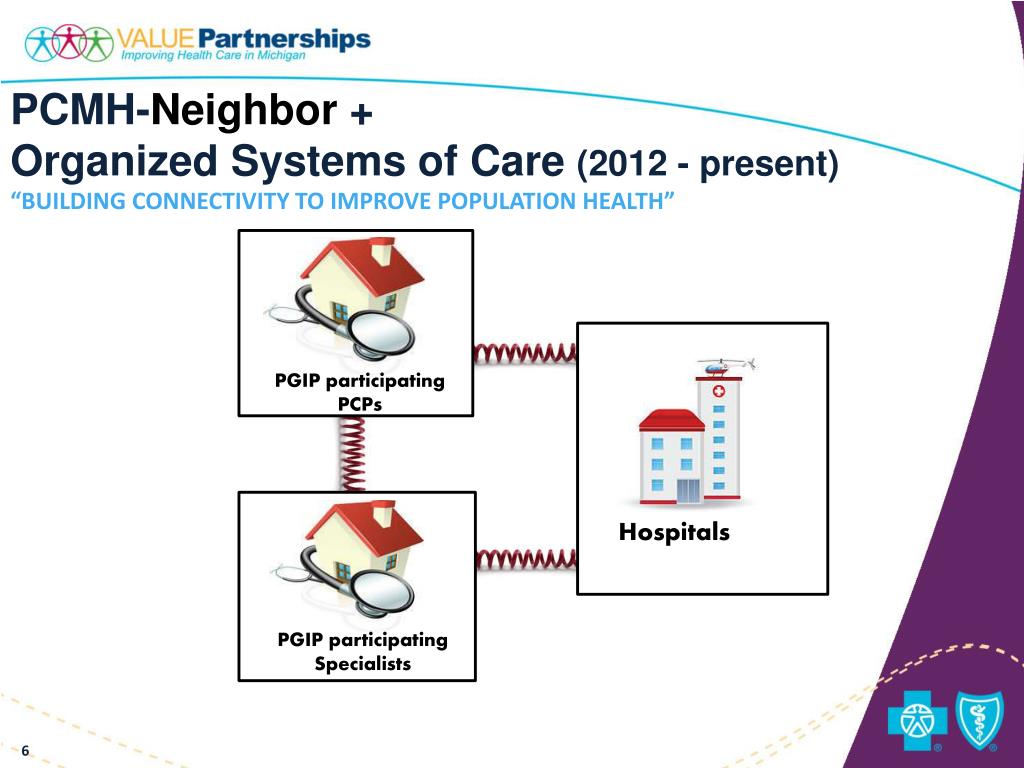 What is the Physician Group Incentive Program? • BCBSM partners with Physician Organizations (POs) to achieve a high performing health care system in Michigan • The Physician Group Incentive Program (PGIP) is moving from a fee-for-service to a fee-for-value approach • PGIP offers rewards to: • POs to assist with infrastructure improvement and practice transformation • Practitioners through fee-for-value-based fee uplifts • Increasingly, a portion of professional reimbursement is tied to rewarding specialists for: • Supporting the Patient Centered Medical Home (PCMH) model as PCMH-Neighbors • Collaborating with their community of caregivers to optimize use, efficiency and quality in their shared patient populations