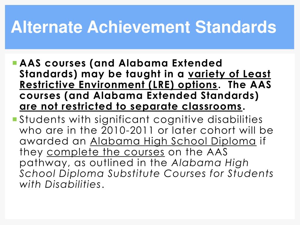 Alternate Achievement Standards • AAS courses (and Alabama Extended Standards) may be taught in a variety of Least Restrictive Environment (LRE) options. The AAS courses (and Alabama Extended Standards) are not restricted to separate classrooms. • Students with significant cognitive disabilities who are in the 2010-2011 or later cohort will be awarded an Alabama High School Diploma if they complete the courses on the AAS pathway, as outlined in the Alabama High School Diploma Substitute Courses for Students with Disabilities.