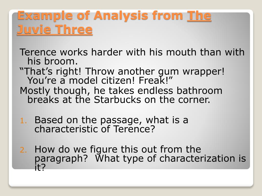 Terence works harder with his mouth than with his broom. “That’s right! Throw another gum wrapper! You’re a model citizen! Freak!” Mostly though, he takes endless bathroom breaks at the Starbucks on the corner. • Based on the passage, what is a characteristic of Terence? • How do we figure this out from the paragraph? What type of characterization is it? Example of Analysis from The Juvie Three