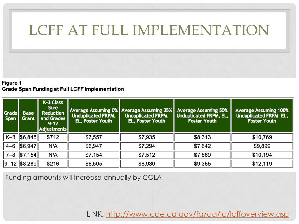 LCFF at Full Implementation Funding amounts will increase annually by COLA LINK: http://www.cde.ca.gov/fg/aa/lc/lcffoverview.asp