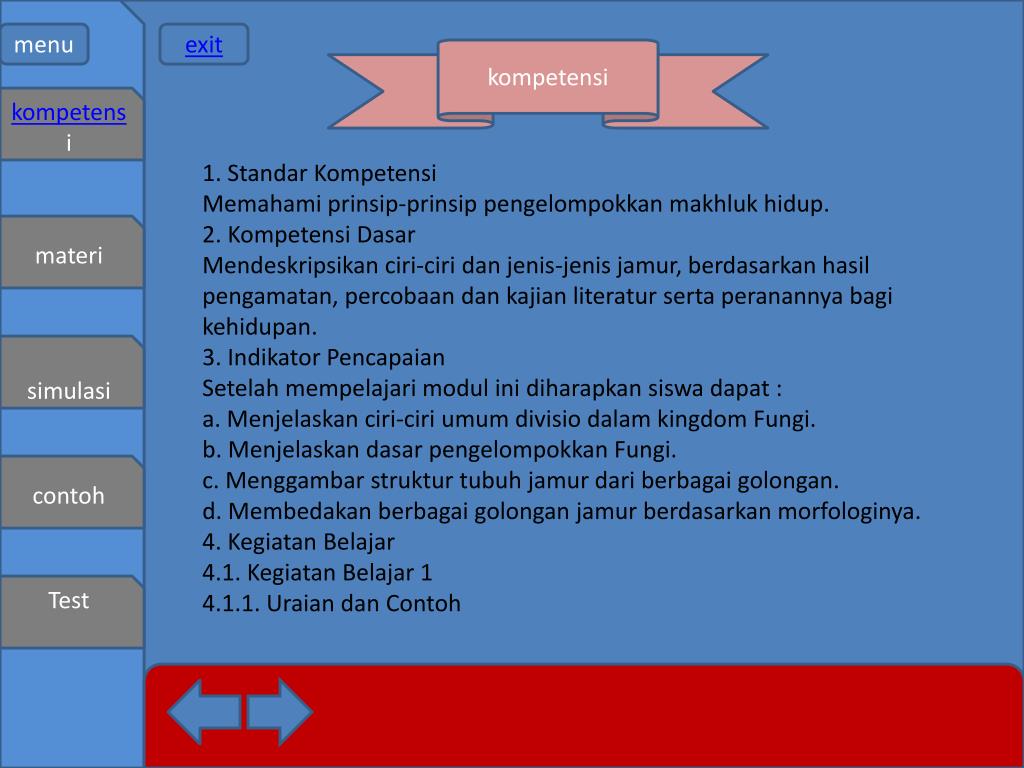 menu exit kompetensi kompetens i 1. Standar KompetensiMemahami prinsip-prinsip pengelompokkan makhluk hidup.2. Kompetensi DasarMendeskripsikan ciri-ciri dan jenis-jenis jamur, berdasarkan hasil pengamatan, percobaan dan kajian literatur serta peranannya bagi kehidupan.3. Indikator PencapaianSetelah mempelajari modul ini diharapkan siswa dapat :a. Menjelaskan ciri-ciri umum divisio dalam kingdom Fungi.b. Menjelaskan dasar pengelompokkan Fungi.c. Menggambar struktur tubuh jamur dari berbagai golongan.d. Membedakan berbagai golongan jamur berdasarkan morfologinya.4. Kegiatan Belajar4.1. Kegiatan Belajar 14.1.1. Uraian dan Contoh materi simulasi contoh Test