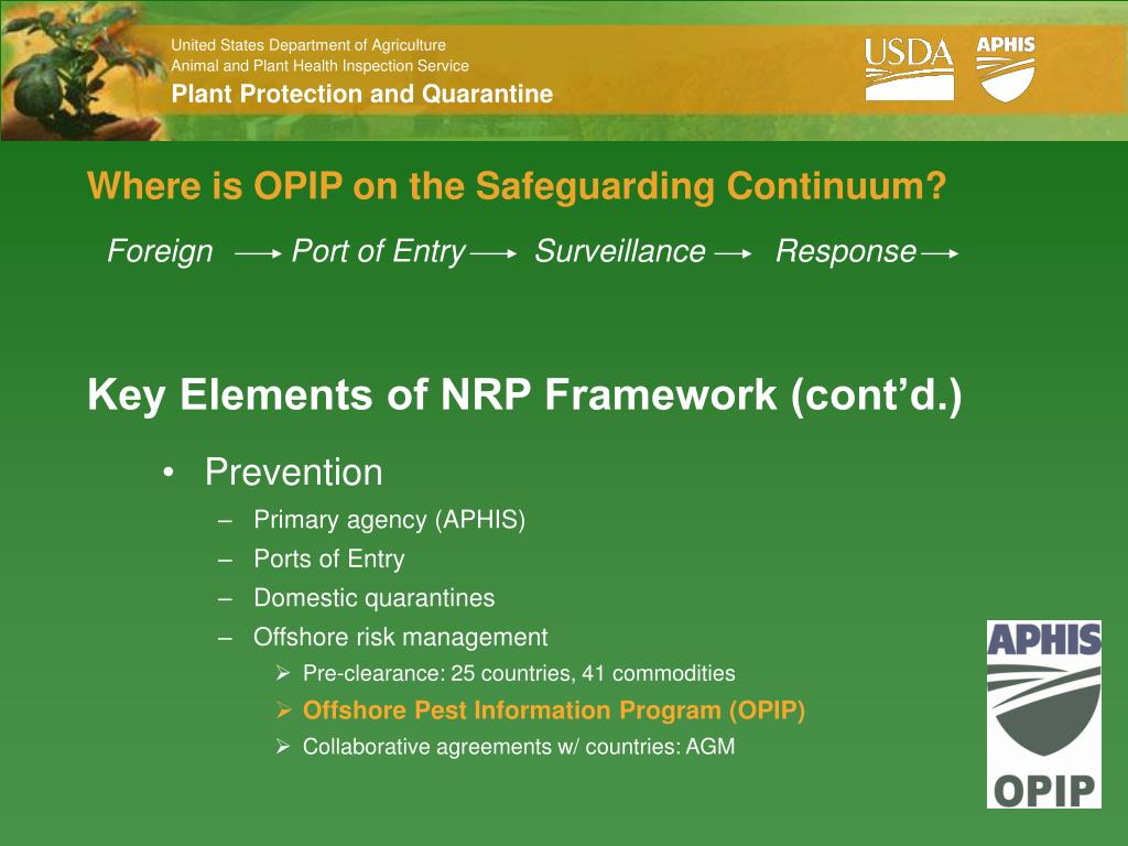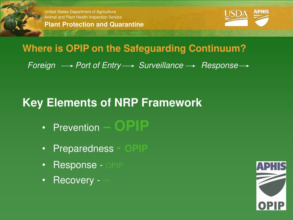 Where is OPIP on the Safeguarding Continuum?Key Elements of NRP Framework Foreign Port of Entry Surveillance Response • Prevention – OPIP • Preparedness - OPIP • Response - OPIP • Recovery - OPIP