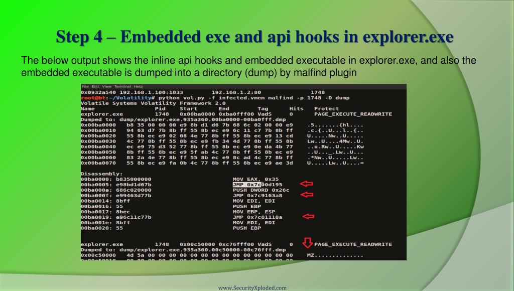 Step 4 – Embedded exe and api hooks in explorer.exe The below output shows the inline api hooks and embedded executable in explorer.exe, and also the embedded executable is dumped into a directory (dump) by malfindplugin www.SecurityXploded.com