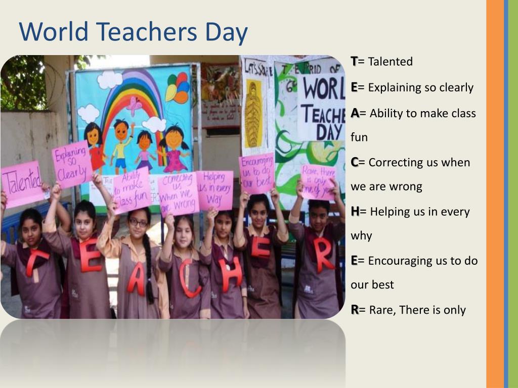 World Teachers Day T= Talented E= Explaining so clearly A= Ability to make class fun C= Correcting us when we are wrong H= Helping us in every why E= Encouraging us to do our best R= Rare, There is only