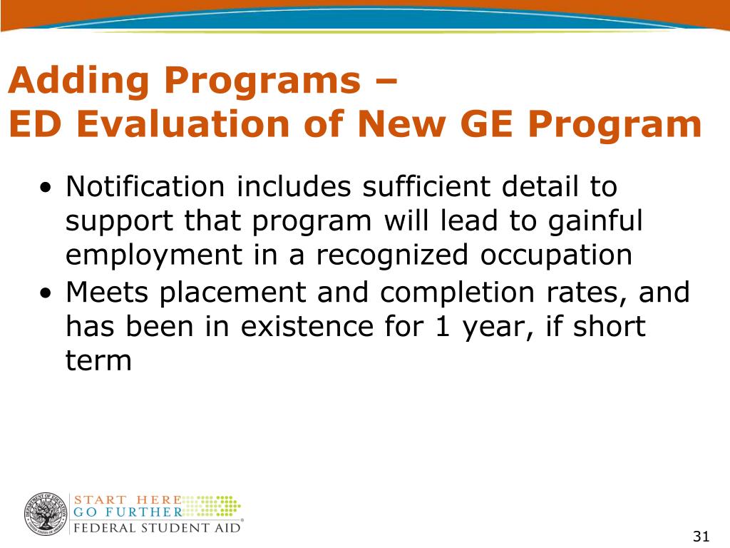Adding Programs – ED Evaluation of New GE Program • Notification includes sufficient detail to support that program will lead to gainful employment in a recognized occupation • Meets placement and completion rates, and has been in existence for 1 year, if short term