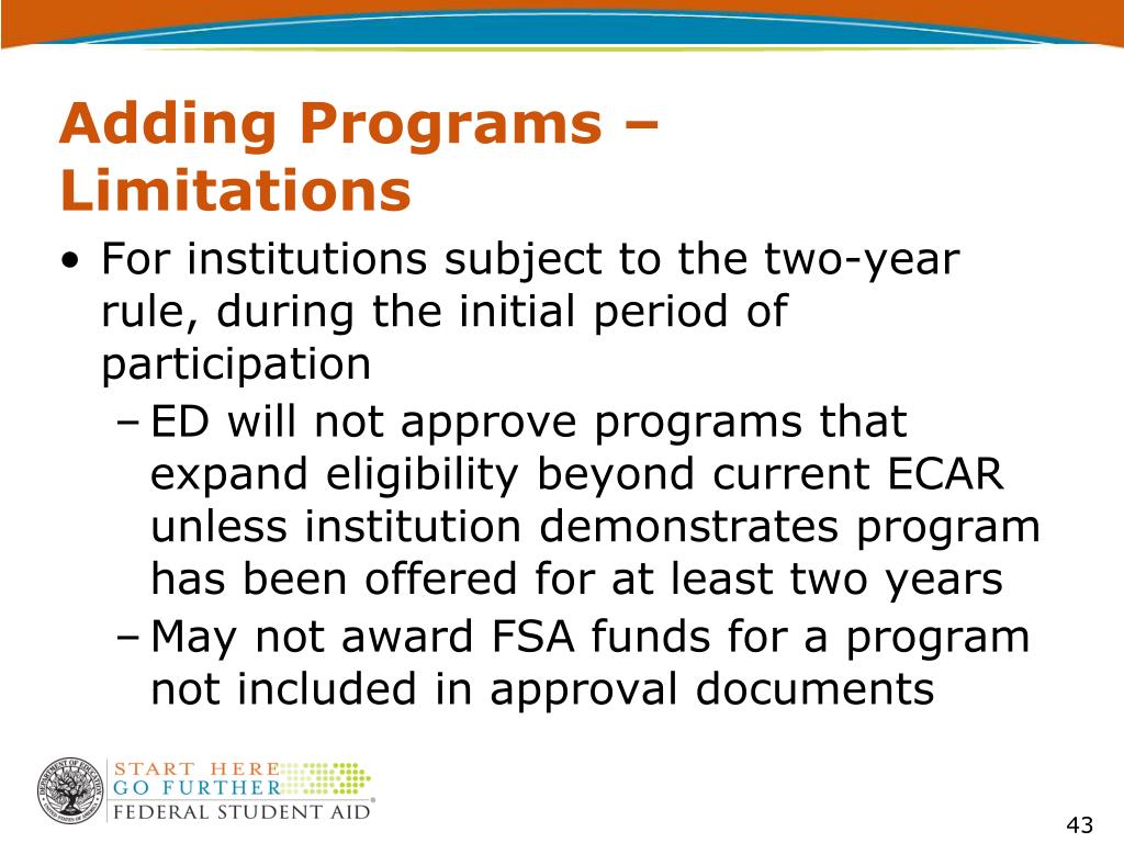 Adding Programs – Limitations • For institutions subject to the two-year rule, during the initial period of participation • ED will not approve programs that expand eligibility beyond current ECAR unless institution demonstrates program has been offered for at least two years • May not award FSA funds for a program not included in approval documents