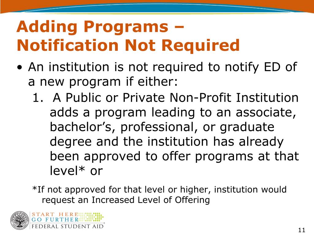 Adding Programs – Notification Not Required • An institution is not required to notify ED of a new program if either: 1. A Public or Private Non-Profit Institution adds a program leading to an associate, bachelor’s, professional, or graduate degree and the institution has already been approved to offer programs at that level* or *If not approved for that level or higher, institution would request an Increased Level of Offering