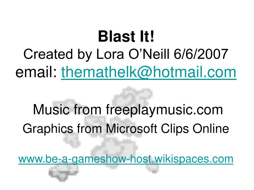 Blast It!Created by Lora O’Neill 6/6/2007email: themathelk@hotmail.comMusic from freeplaymusic.comGraphics from Microsoft Clips Onlinewww.be-a-gameshow-host.wikispaces.com