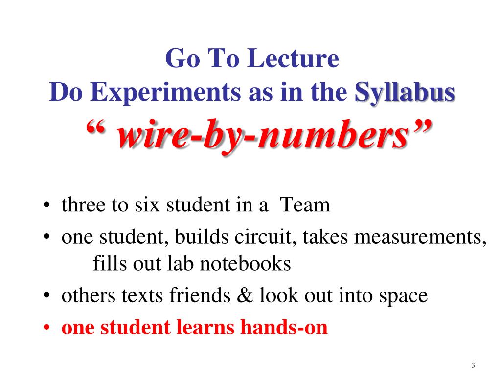 Go To LectureDo Experiments as in the Syllabus“wire-by-numbers” • three to six student in a Team • one student, builds circuit, takes measurements, fills out lab notebooks • others texts friends & look out into space • one student learns hands-on