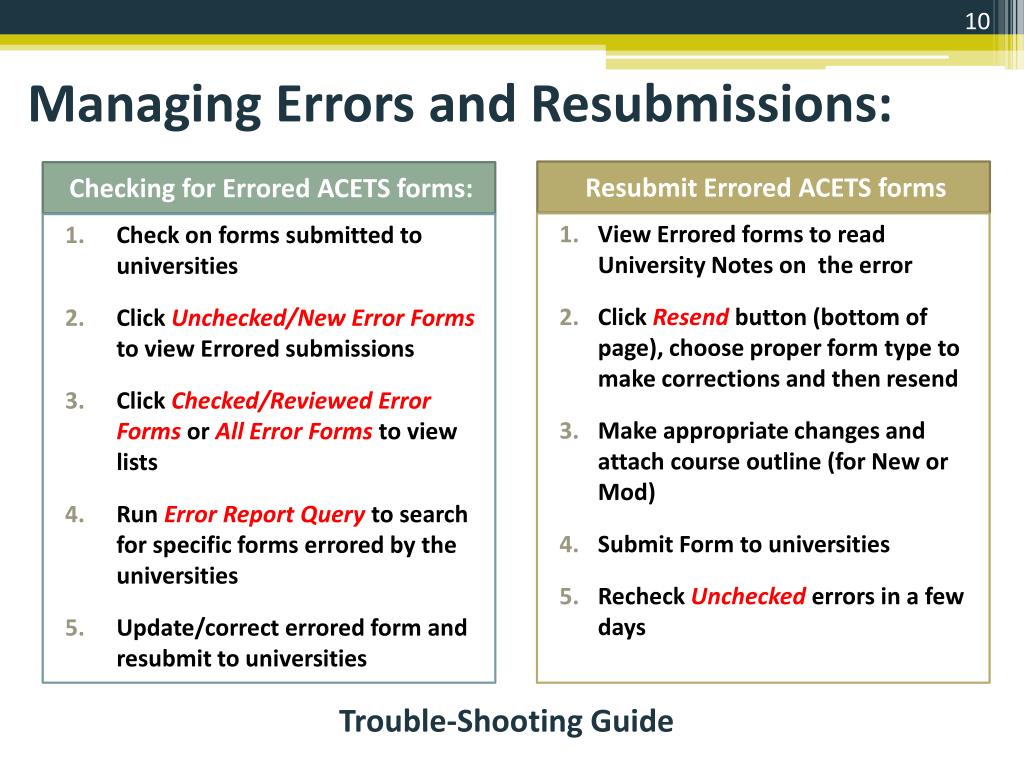 Managing Errors and Resubmissions: Checking for Errored ACETS forms: Resubmit Errored ACETS forms • View Errored forms to read University Notes on the error • Click Resend button (bottom of page), choose proper form type to make corrections and then resend • Make appropriate changes and attach course outline (for New or Mod) • Submit Form to universities • Recheck Unchecked errors in a few days • Check on forms submitted to universities • Click Unchecked/New Error Forms to view Errored submissions • Click Checked/Reviewed Error Forms or All Error Formsto view lists • Run Error Report Query to search for specific forms errored by the universities • Update/correct errored form and resubmit to universities Trouble-Shooting Guide