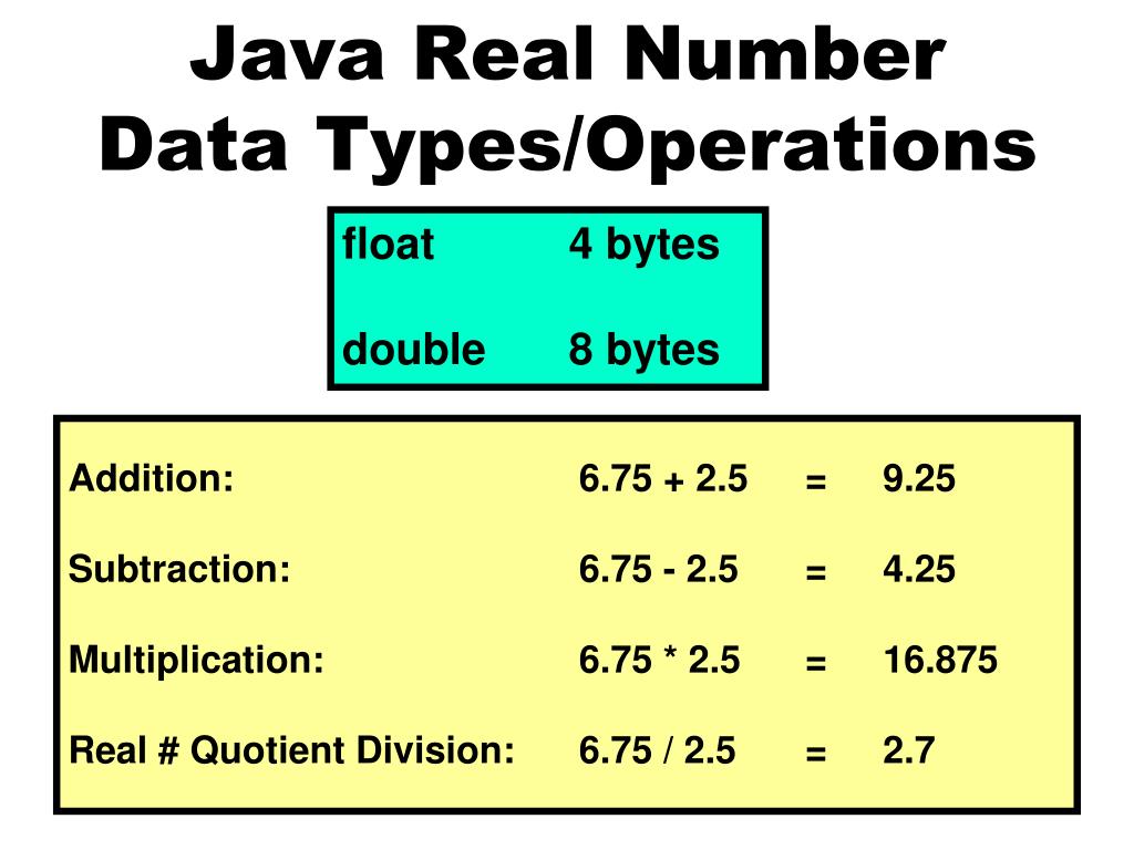 Java Real NumberData Types/Operations float 4 bytes double 8 bytes Addition: 6.75 + 2.5 = 9.25 Subtraction: 6.75 - 2.5 = 4.25 Multiplication: 6.75 * 2.5 = 16.875 Real # Quotient Division: 6.75 / 2.5 = 2.7