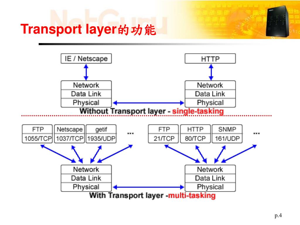 NetGuru by NetSmooth Corporation. 創新 網路通訊實驗教學解決方案. PART I TCP/IP 通訊協定深入剖析 / 以 NetGuru 實作. 第四章 UDP/TCP/ICMP 通訊協定與 Packet 分析. Overview. UDP 通訊協定 TCP 通訊協定 ICMP 通訊協定 實驗導引 實驗 4.1 比較 IP checksum 及 TCP checksum 實驗 4.2 了解 port number 的涵意 實驗 4.3 觀察 TCP 之連線及中斷連線. Transport Layer.