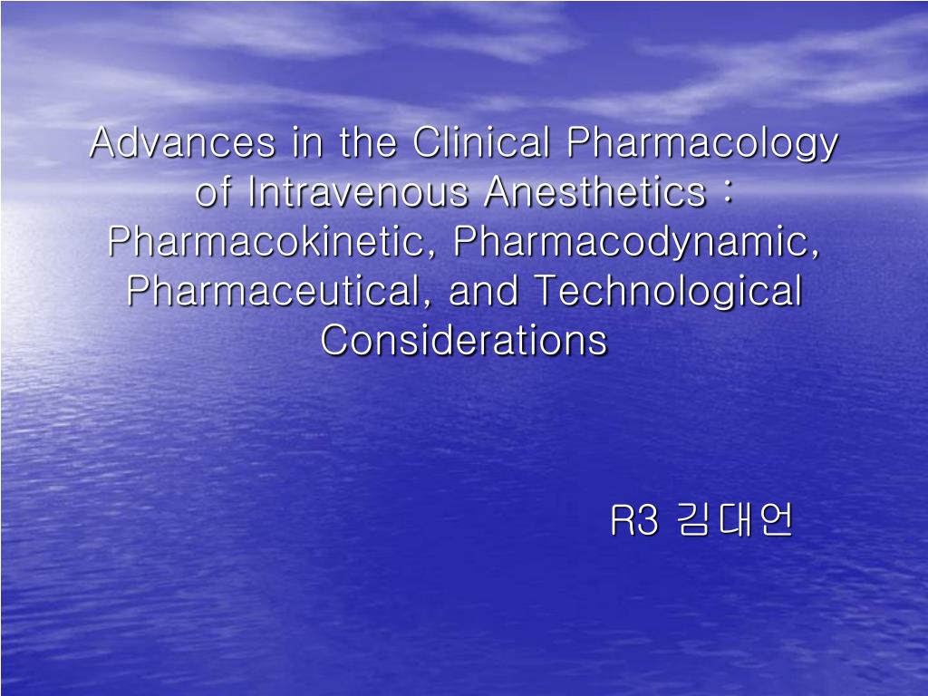 Advances in the Clinical Pharmacology of Intravenous Anesthetics : Pharmacokinetic, Pharmacodynamic, Pharmaceutical, and Technological Considerations. R3 김대언. Total intravenous anesthesia now an appealing, workable alternative to the inhalational anesthesia .
