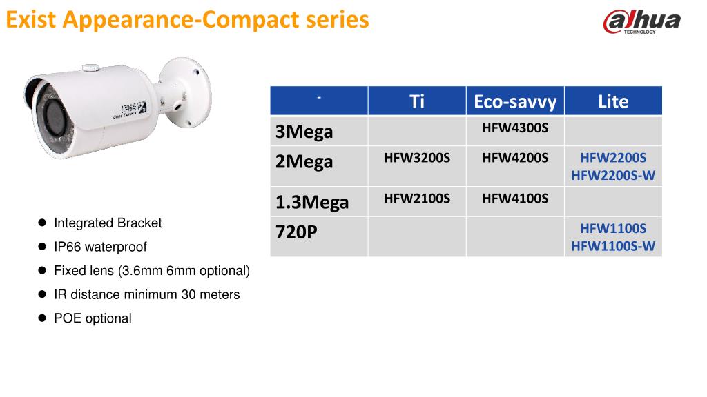 Smart Series Ti DM365/368 Ambarella A5S 3M HFW4300S 2M HFW3200S HFW4200S 1.3M HFW2100S HFW4100S 3M HDW4300S Smart series • Upgrade 2M HDW3200S HDW4200S 1.3M HDW2100 HDW4100S 3M HDB4300C 2M HDB3200C HDB4200C 1.3M HD2100 HDB4100C