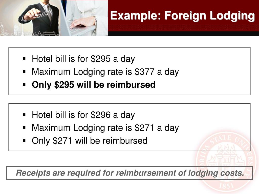Foreign Travel - Lodging • Lodging will only be reimbursed based upon the original paid lodging receipt and only up to the maximum foreign lodging amount as specified in the U. S. Department of State Tables, found at: Foreign Per Diem on the FSU Travel website http://control.vpfa.fsu.edu/Travel/Foreign-Travel-Information/Foreign-Meals-Lodging