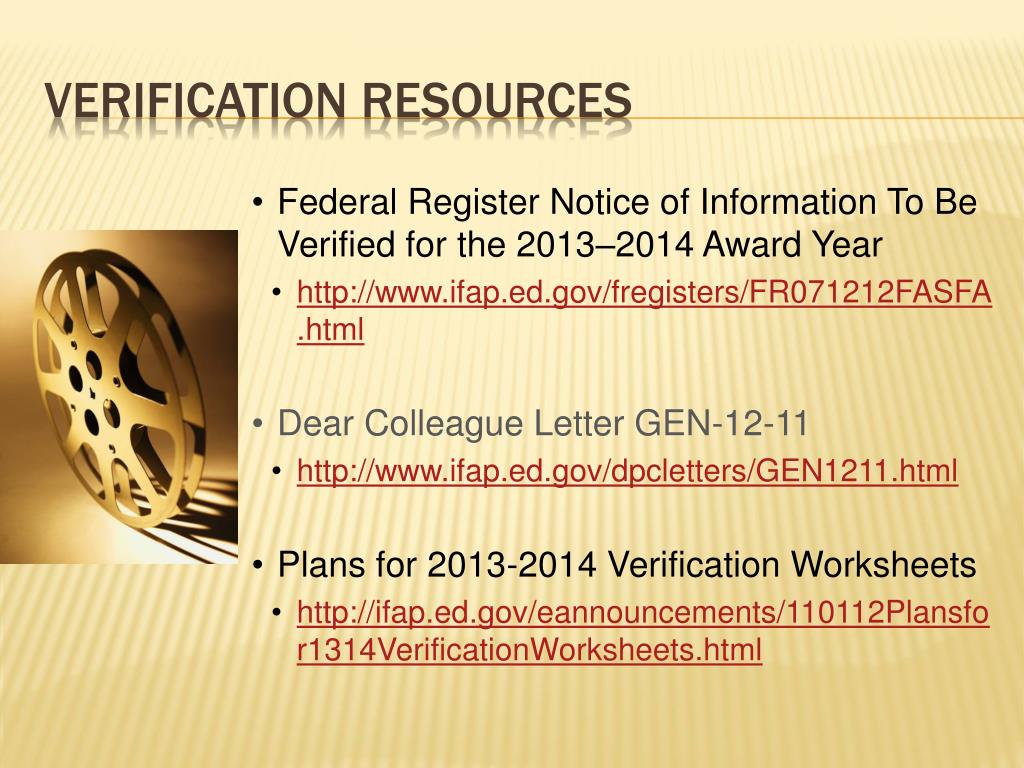 Federal Register Notice of Information To Be Verified for the 2013–2014 Award Year • http://www.ifap.ed.gov/fregisters/FR071212FASFA.html • Dear Colleague Letter GEN-12-11 • http://www.ifap.ed.gov/dpcletters/GEN1211.html • Plans for 2013-2014 Verification Worksheets • http://ifap.ed.gov/eannouncements/110112Plansfor1314VerificationWorksheets.html Verification resources
