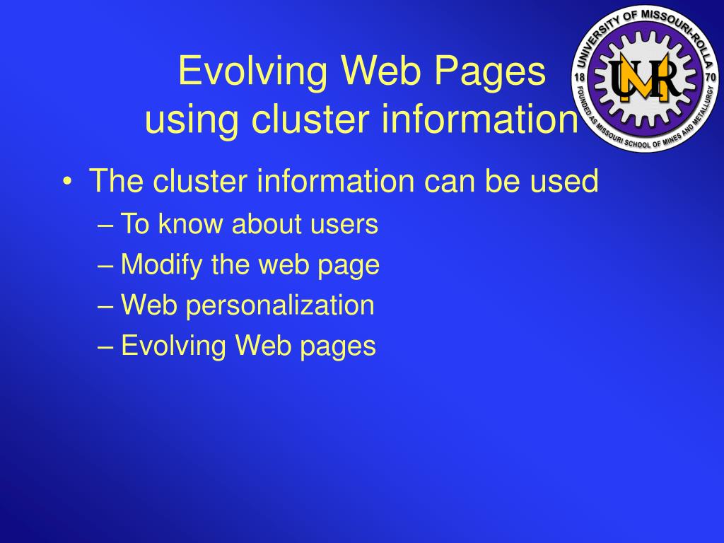 Evolving Web Pagesusing cluster information • The cluster information can be used • To know about users • Modify the web page • Web personalization • Evolving Web pages