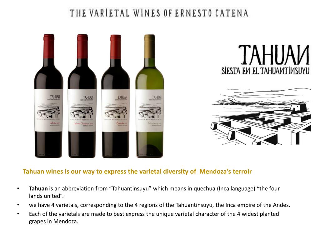 Tahuan is an abbreviation from “Tahuantinsuyu” which means in quechua (Inca language) “the four lands united”. • we have 4 varietals, corresponding to the 4 regions of the Tahuantinsuyu, the Inca empire of the Andes. • Each of the varietals are made to best express the unique varietal character of the 4 widest planted grapes in Mendoza. Tahuan wines is our way to express the varietal diversity of Mendoza’s terroir