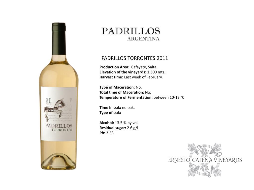 PADRILLOS TORRONTES 2011 ProductionArea:Cafayate, Salta. Elevation of the vineyards: 1.300 mts. Harvest time: Last week of February. Type of Maceration: No. Total time of Maceration: No. Temperature of Fermentation: between 10-13 °C Time in oak: no oak. Type of oak: Alcohol: 13.5 % by vol. Residual sugar: 2.6 g/l. Ph: 3.53