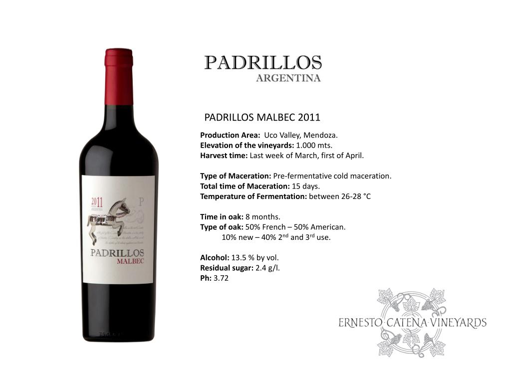 PADRILLOS MALBEC 2011 ProductionArea:Uco Valley, Mendoza. Elevation of the vineyards: 1.000 mts. Harvest time: Last week of March, first of April. Type of Maceration: Pre-fermentative cold maceration. Total time of Maceration: 15 days. Temperature of Fermentation: between 26-28 °C Time in oak: 8 months. Type of oak: 50% French – 50% American. 10% new – 40% 2nd and 3rd use. Alcohol: 13.5 % by vol. Residual sugar: 2.4 g/l. Ph: 3.72
