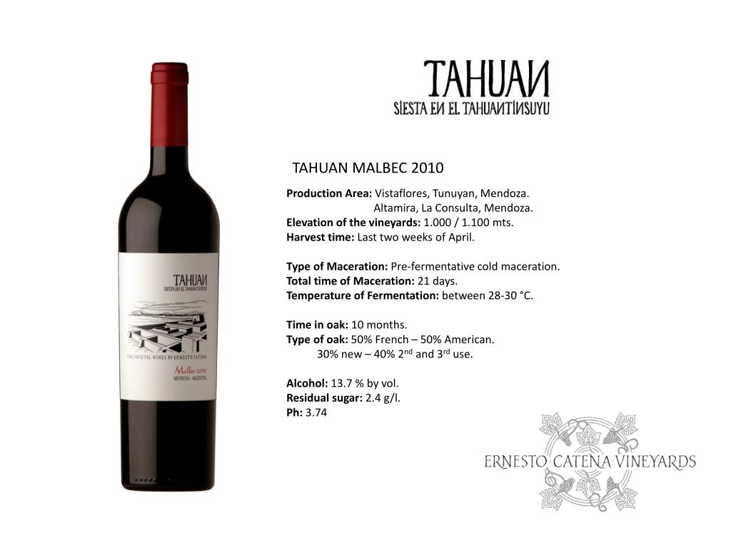 TAHUAN MALBEC 2010 Production Area: Vistaflores, Tunuyan, Mendoza. Altamira, La Consulta, Mendoza. Elevation of the vineyards: 1.000 / 1.100 mts. Harvest time: Last two weeks of April. Type of Maceration: Pre-fermentative cold maceration. Total time of Maceration: 21 days. Temperature of Fermentation: between 28-30 °C. Time in oak: 10 months. Type of oak: 50% French – 50% American. 30% new – 40% 2nd and 3rd use. Alcohol: 13.7 % by vol. Residual sugar: 2.4 g/l. Ph: 3.74