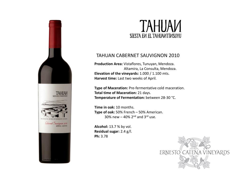 TAHUAN CABERNET SAUVIGNON 2010 ProductionArea: Vistaflores, Tunuyan, Mendoza. Altamira, La Consulta, Mendoza. Elevation of the vineyards: 1.000 / 1.100 mts. Harvest time: Last two weeks of April. Type of Maceration: Pre-fermentative cold maceration. Total time of Maceration: 21 days. Temperature of Fermentation: between 28-30 °C. Time in oak: 10 months. Type of oak: 50% French – 50% American. 30% new – 40% 2nd and 3rd use. Alcohol: 13.7 % by vol. Residual sugar: 2.4 g/l. Ph: 3.78