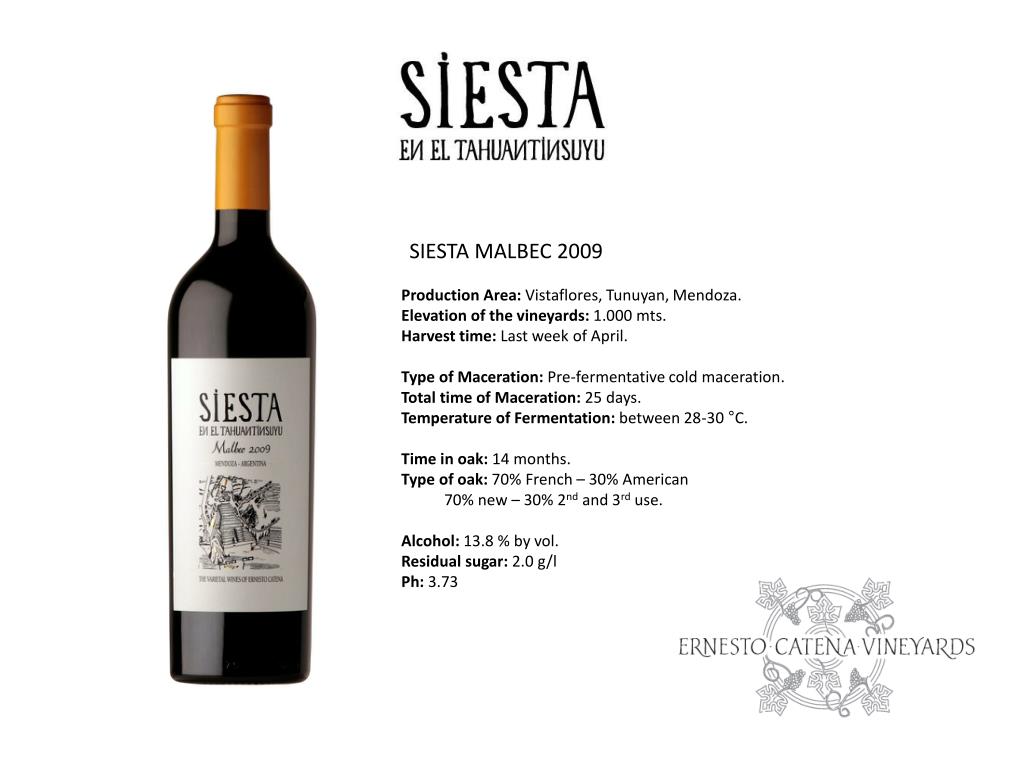SIESTA MALBEC 2009 Production Area: Vistaflores, Tunuyan, Mendoza. Elevation of the vineyards: 1.000 mts. Harvest time: Last week of April. Type of Maceration: Pre-fermentative cold maceration. Total time of Maceration: 25 days. Temperature of Fermentation: between 28-30 °C. Time in oak: 14 months. Type of oak: 70% French – 30% American 70% new – 30% 2nd and 3rd use. Alcohol: 13.8 % by vol. Residual sugar: 2.0 g/l Ph: 3.73