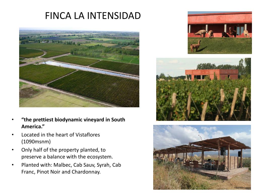 FINCA LA INTENSIDAD “the prettiest biodynamic vineyard in South America.” Located in the heart of Vistaflores (1090msnm) Only half of the property planted, to preserve a balance with the ecosystem. Planted with: Malbec, Cab Sauv, Syrah, Cab Franc, Pinot Noir and Chardonnay.