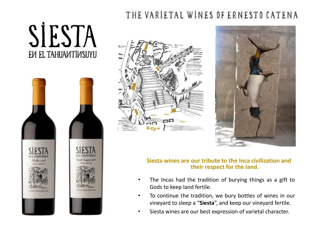The Incas had the tradition of burying things as a gift to Gods to keep land fertile. • To continue the tradition, we bury bottles of wines in our vineyard to sleep a “Siesta”, and keep our vineyard fertile. • Siesta wines are our best expression of varietal character. Siesta wines are our tribute to the Inca civilization and their respect for the land.