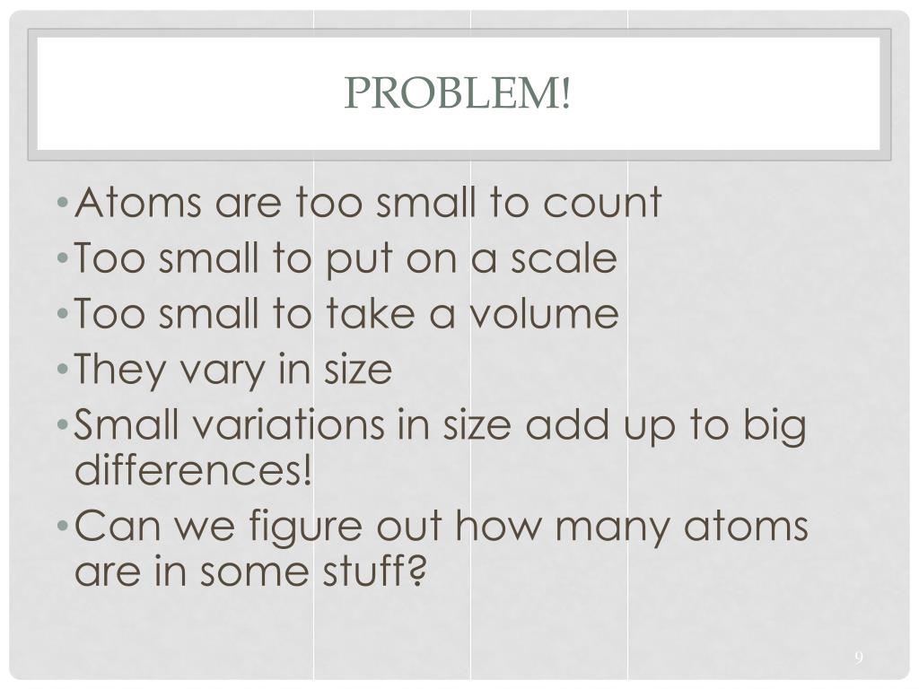 Problem! • Atoms are too small to count • Too small to put on a scale • Too small to take a volume • They vary in size • Small variations in size add up to big differences! • Can we figure out how many atoms are in some stuff?