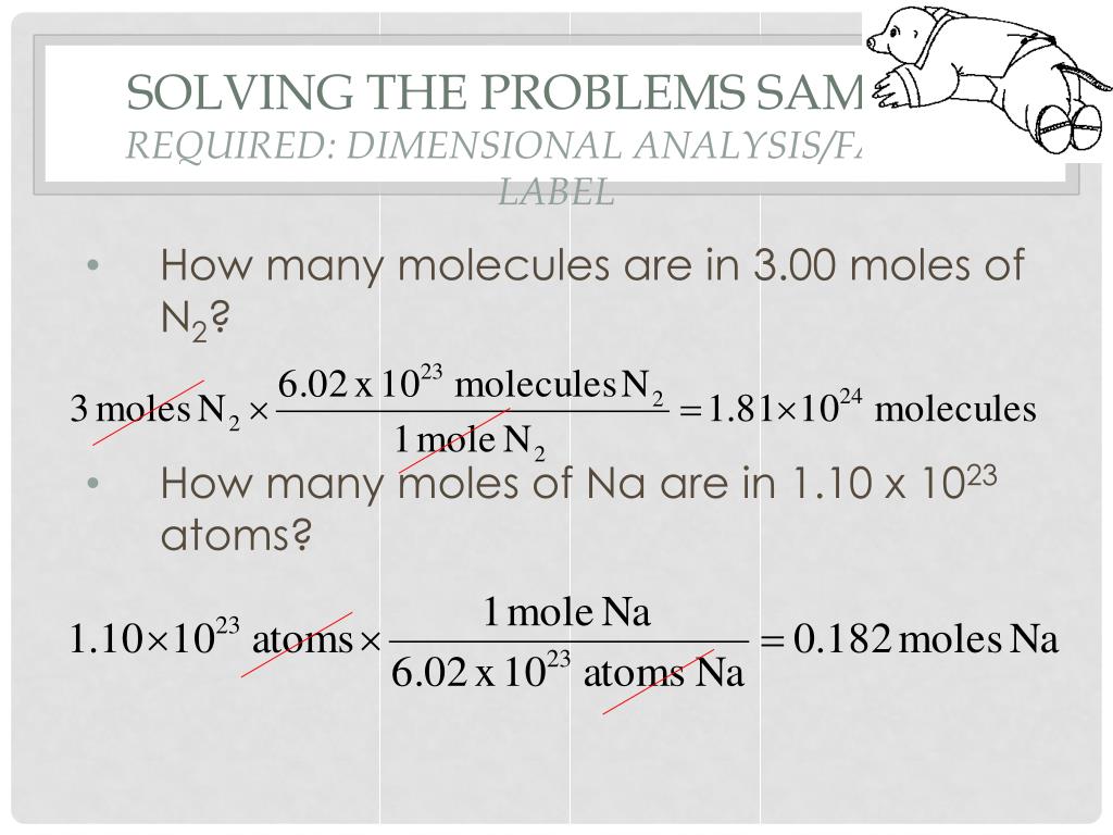 Solving the Problems Samples Required: dimensional analysis/factor label • How many molecules are in 3.00 moles of N2? • How many moles of Na are in 1.10 x 1023 atoms?