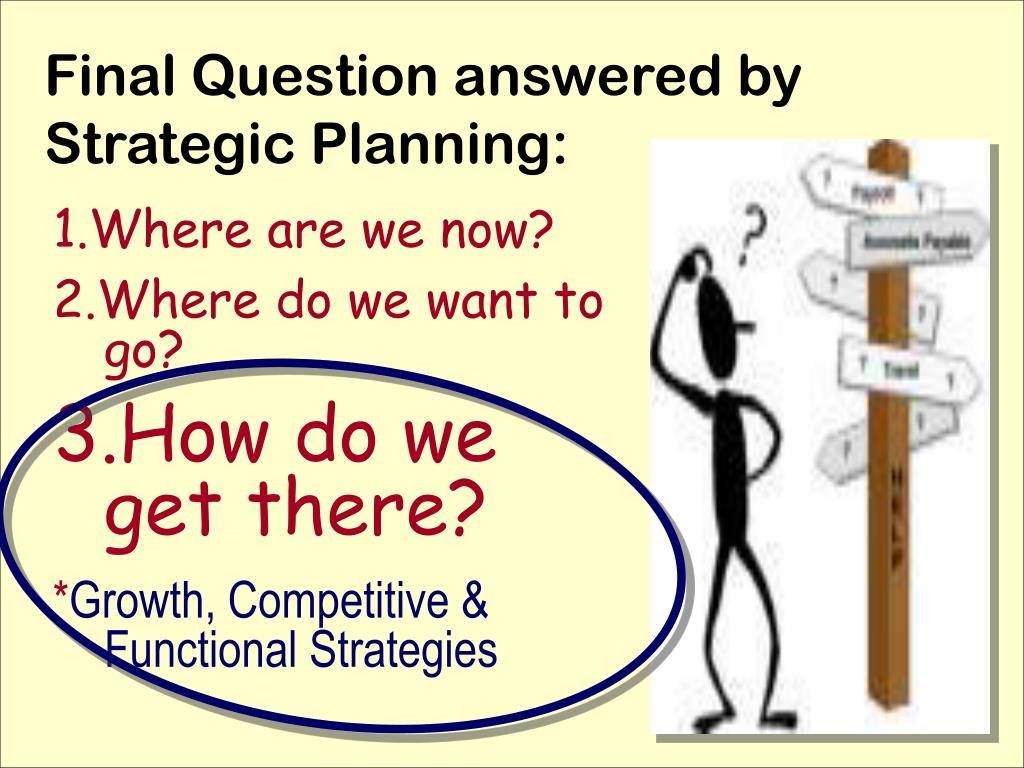 Final Question answered by Strategic Planning: 1.Where are we now? 2.Where do we want to go? 3.How do we get there? *Growth, Competitive & Functional Strategies