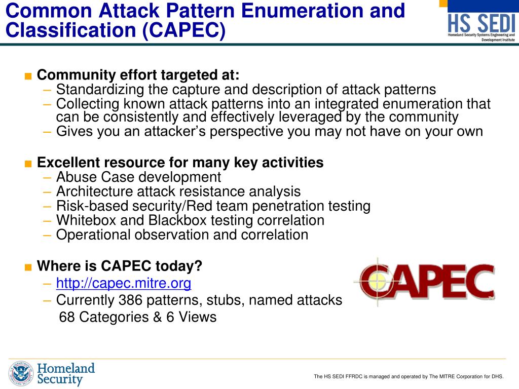 Common Attack Pattern Enumeration and Classification (CAPEC) Community effort targeted at: Standardizing the capture and description of attack patterns Collecting known attack patterns into an integrated enumeration that can be consistently and effectively leveraged by the community Gives you an attacker’s perspective you may not have on your own Excellent resource for many key activities Abuse Case development Architecture attack resistance analysis Risk-based security/Red team penetration testing Whitebox and Blackbox testing correlation Operational observation and correlation Where is CAPEC today? http://capec.mitre.org Currently 386 patterns, stubs, named attacks 68 Categories & 6 Views