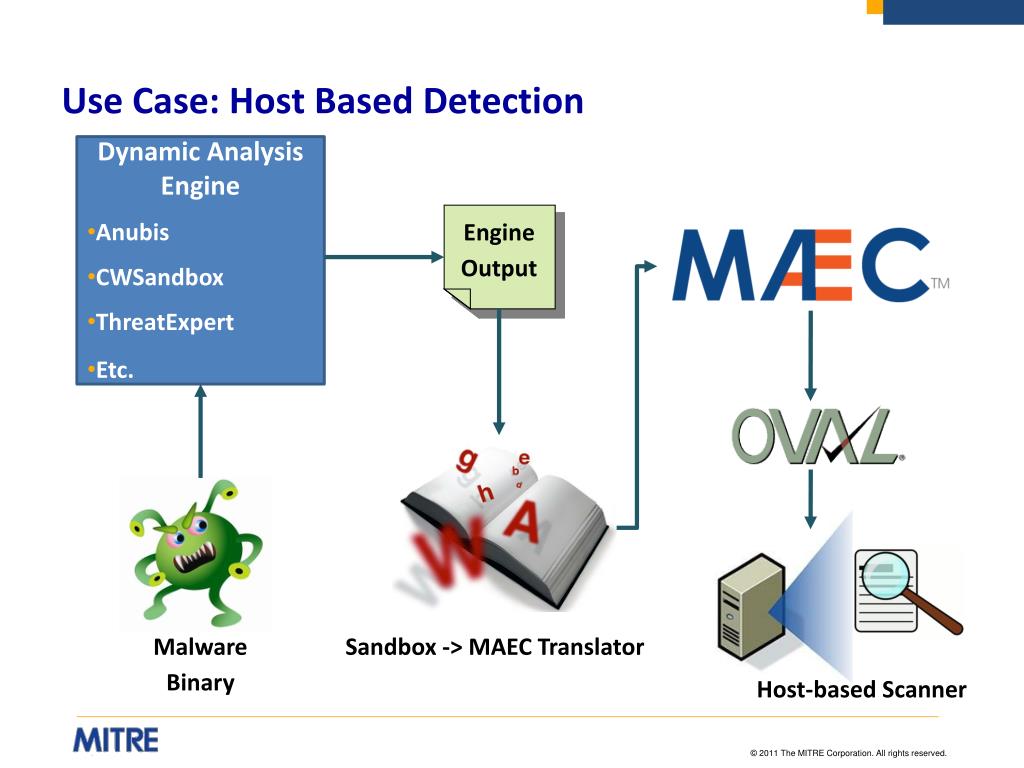 Use Case: Host Based Detection • Dynamic Analysis Engine • Anubis • CWSandbox • ThreatExpert • Etc. Engine Output Malware Binary Sandbox -> MAEC Translator Host-based Scanner