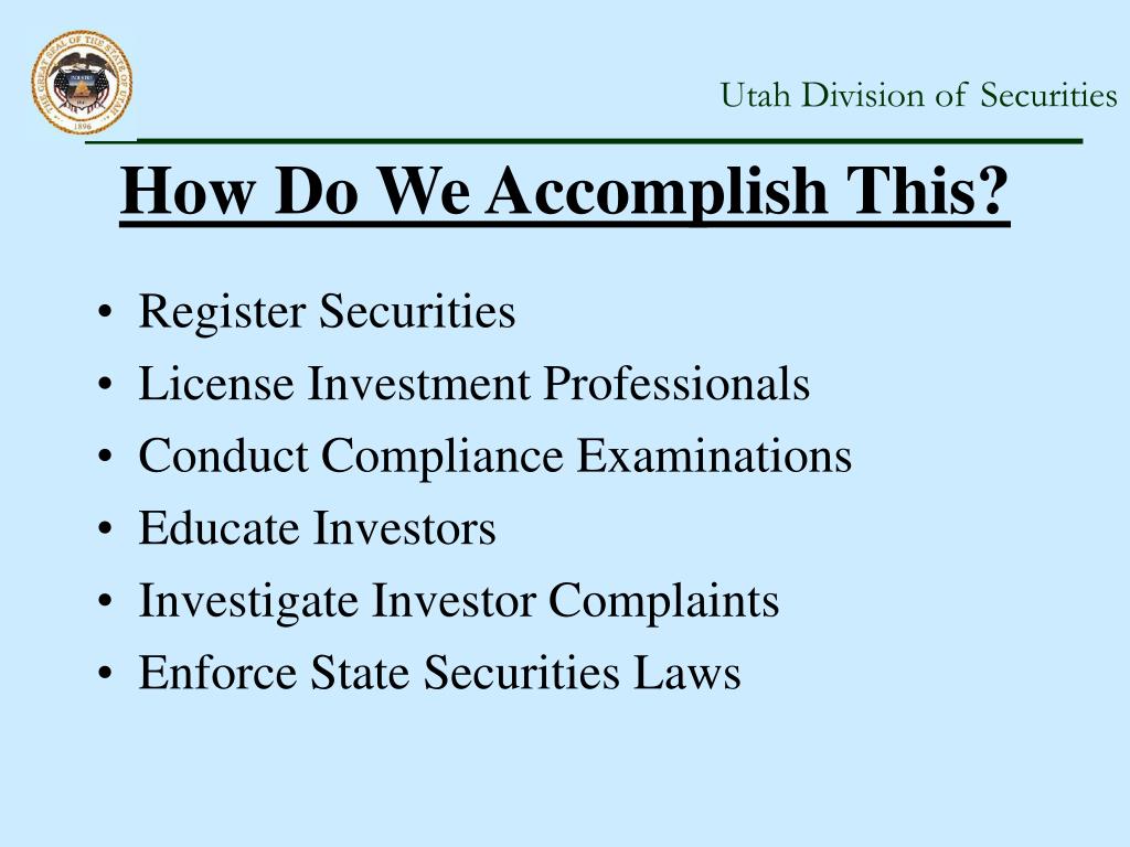Register Securities License Investment Professionals Conduct Compliance Examinations Educate Investors Investigate Investor Complaints Enforce State Securities Laws How Do We Accomplish This?